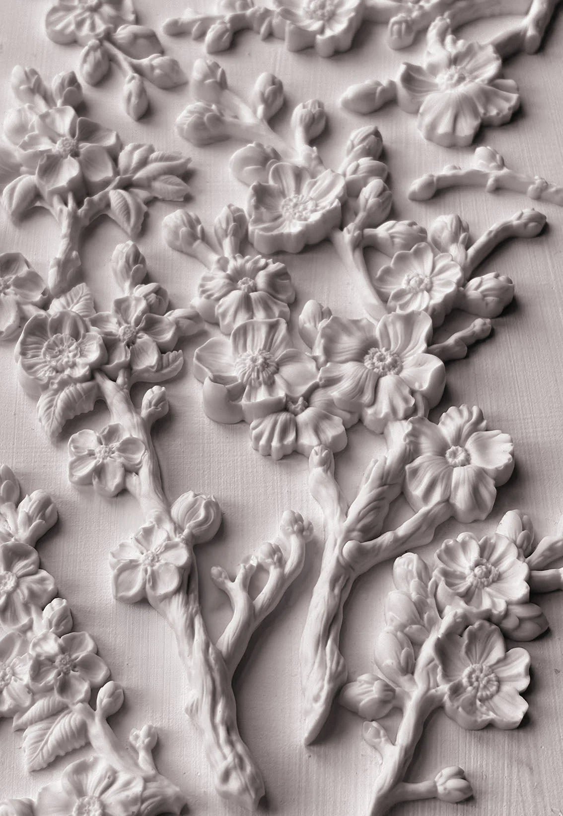 IOD Blossom Decor Mould by Iron Orchid Designs is a scrumptious mould bursting with the plentiful beauty of springtime cherry blossoms. With its delicate, ruffly flowers and layered details, this mould captures the depth and delight of blossoms in full Spring bloom—some front and center, others tucked just behind, creating lots of movement and dimension.