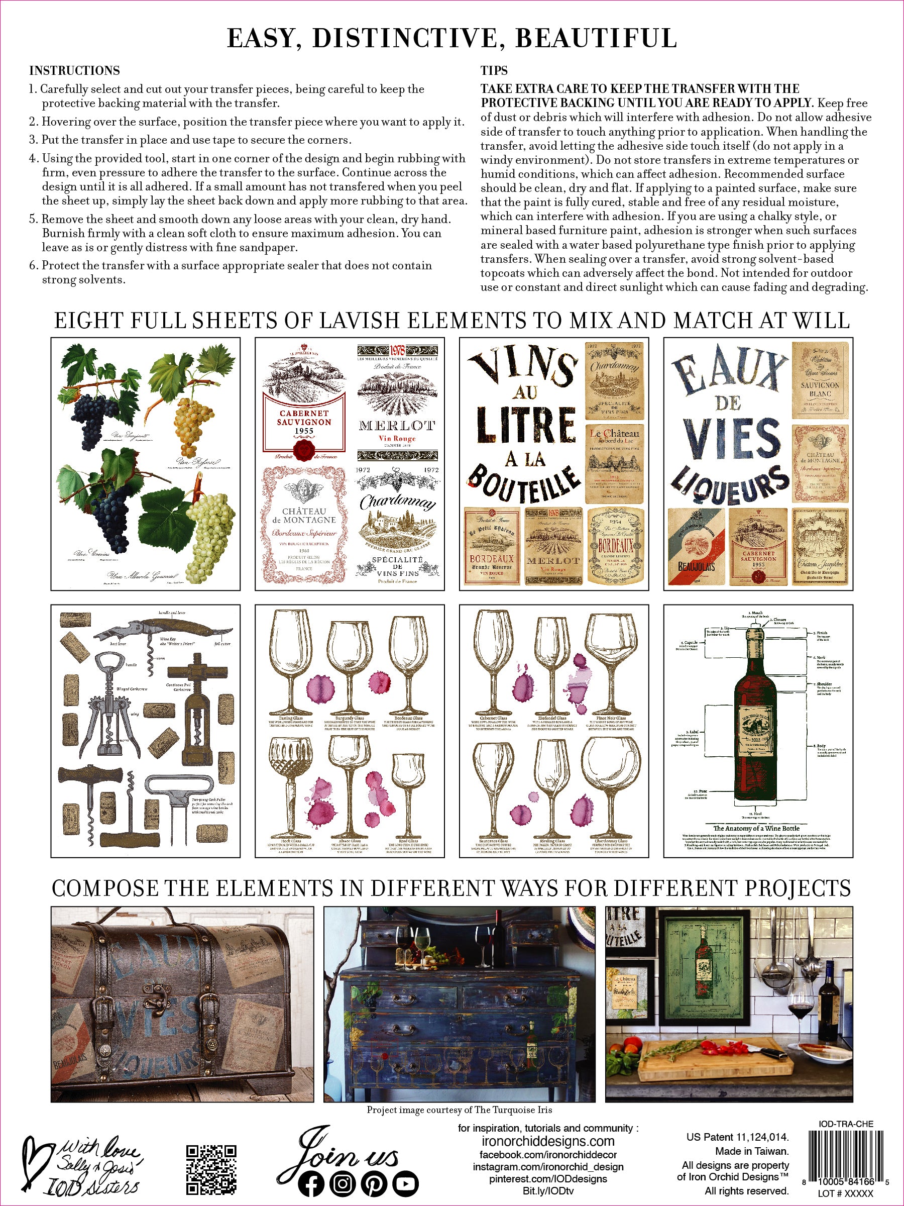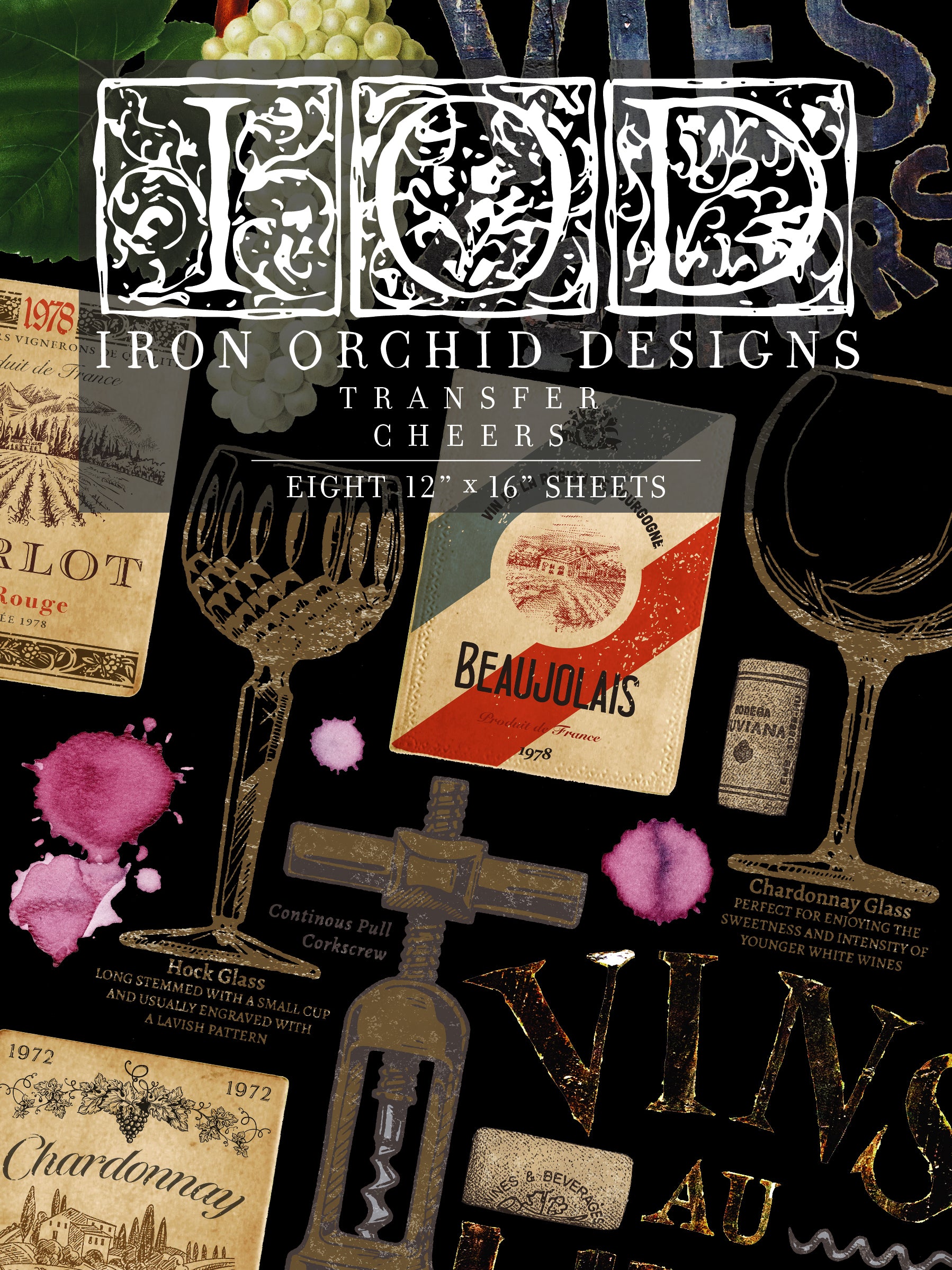 The IOD Decor Transfer "Cheer" is a delightful addition to any wine-themed decor, featuring charming illustrations and elegant typography. With its focus on wine-related motifs, this transfer effortlessly adds a touch of rustic elegance to furniture, walls, or any other surface.