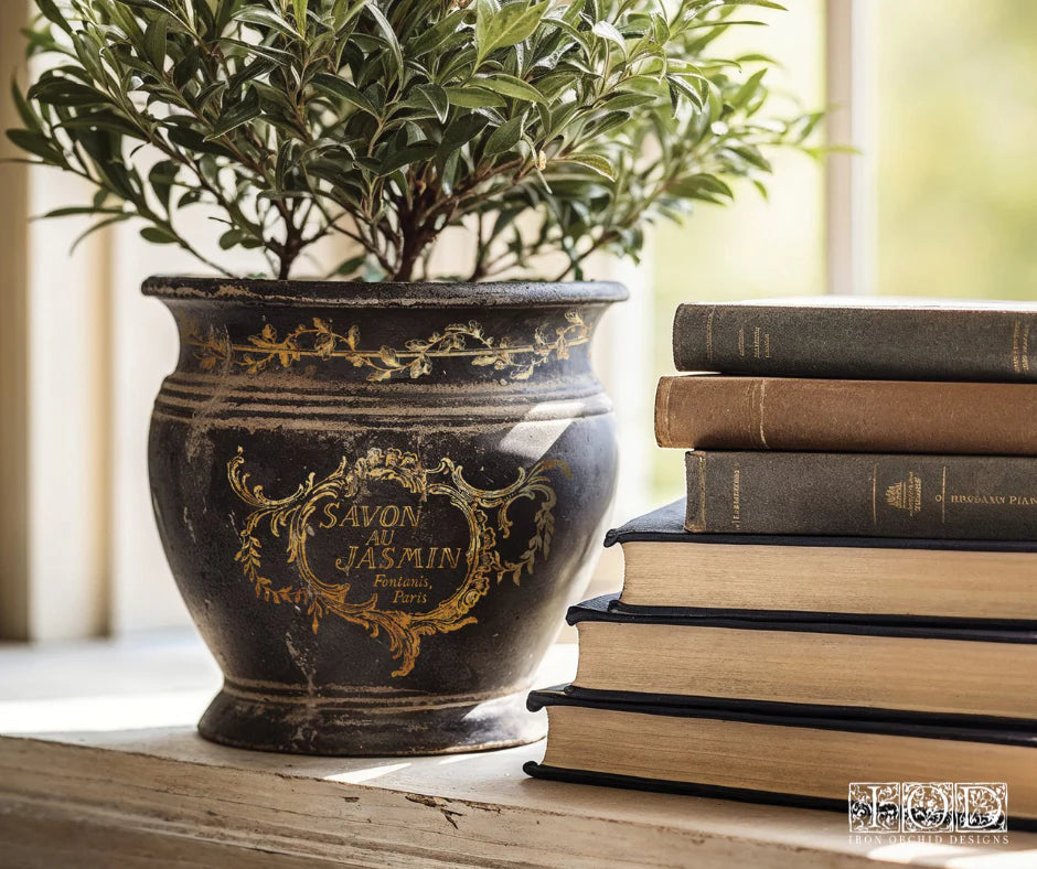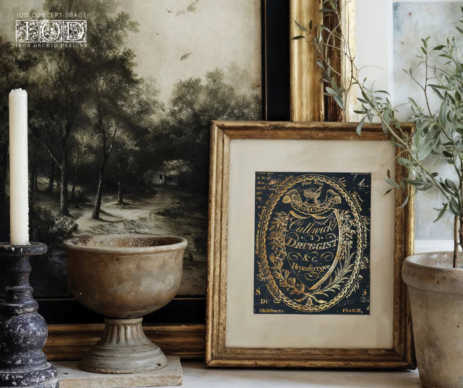 New for Summer 2024, IOD Étiquettes Gilded Transfer! A sophisticated European gilded transfer collection, the IOD Étiquettes Gilded Decor Transfer by Iron Orchid Designs is perfect for goth-glam styles and seamlessly integrates into French farmhouse aesthetics when used on neutral colors and softened with a patina or slight antiquing.