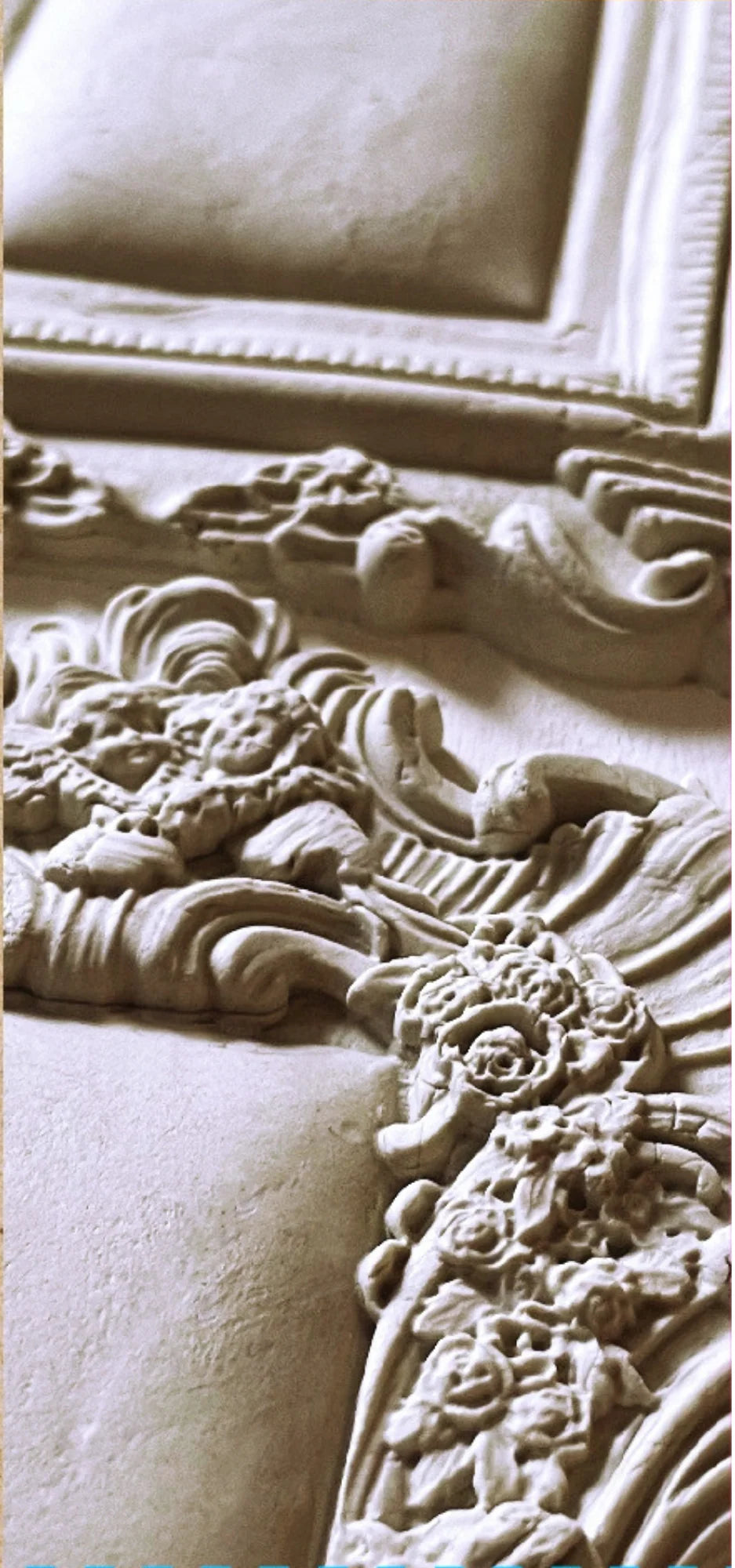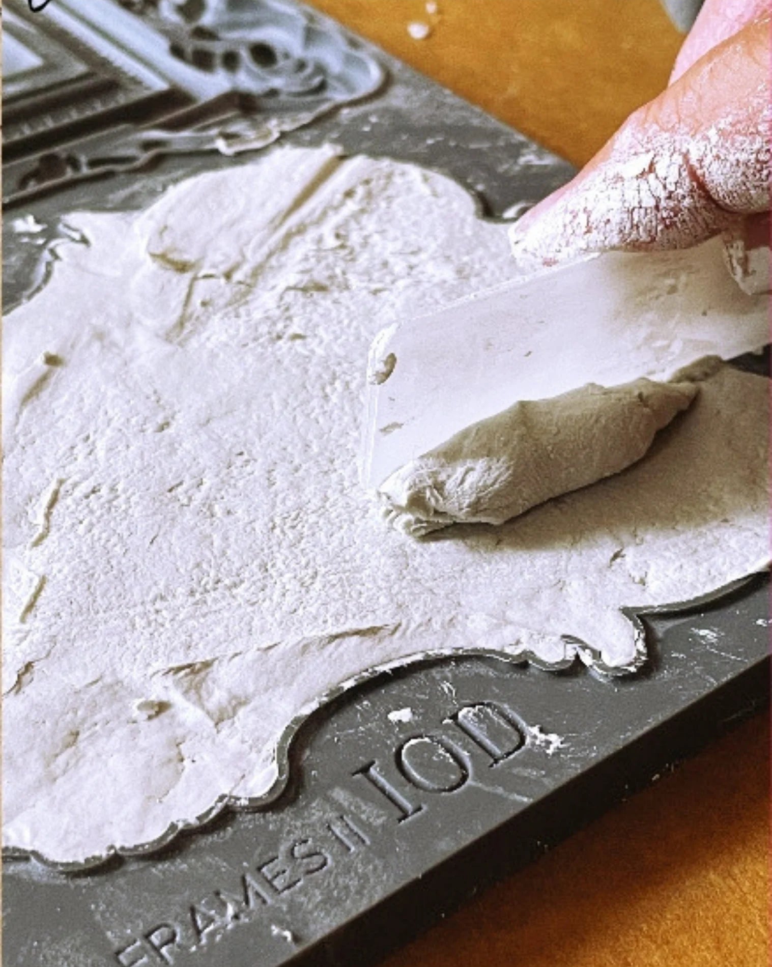 Air dry clay, or paper clay: IOD Air Dry Clay is an air dry medium, and one of our favorites. Like most paper pulp based air dry clays, some shrinking, warping, and cracking is inherent. We like these qualities for a distressed, authentically vintage look. Our favorite way to apply moulded pieces is to remove them from the mould while still moist, and adhere to the surface with the appropriate glue so it conforms well. For vertical surfaces, use a piece of low tack tape to hold it in place so it doesn’t slide.