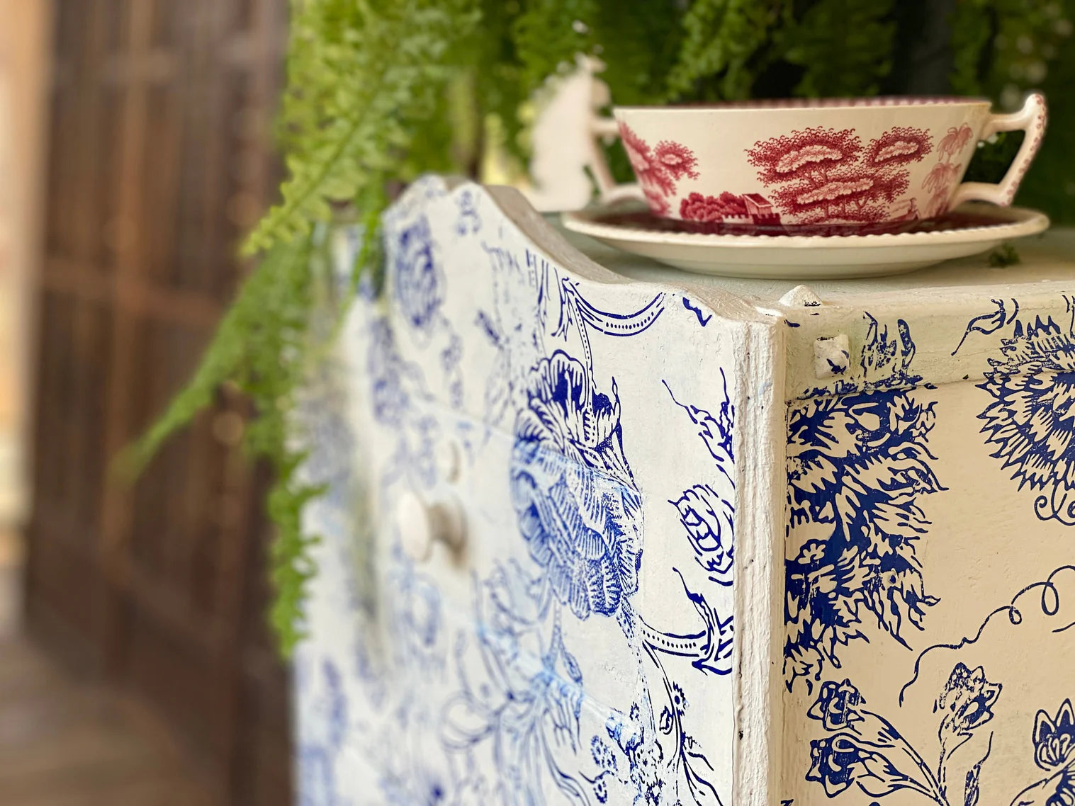 Our Indigo Floral Paint Inlay was inspired by the intertwining and rambling florals found on a 1780 cotton bedcover from India. Depending upon how it is used, this delicate and deep blue Paint Inlay can exude either a classic or bohemia esthetic.