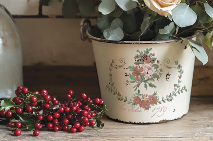 Use La Folie to create romantic small decor sets with floral borders and botanical swags, or pair it with creamy ivory chalk paint on a tray or IOD Wood Arch for an elegant French relief. Embellish a chippy vintage bench or chest for a timeless piece that introduces French countryside charm to your home all season long.