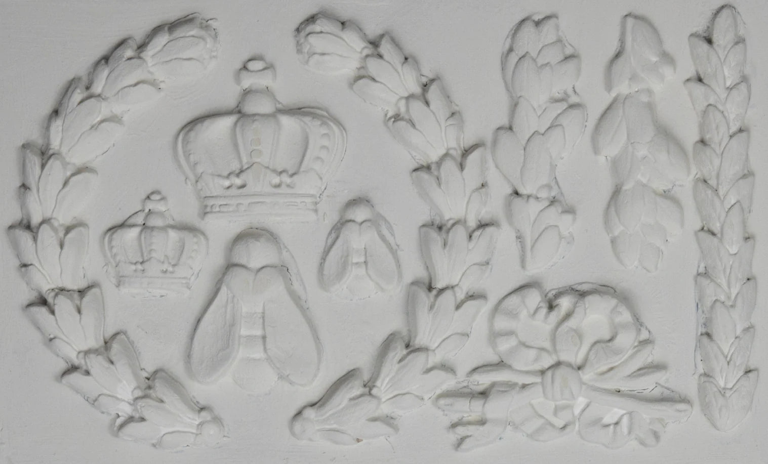 Air dry clay, or paper clay: IOD Air Dry Clay is an air dry medium, and one of our favorites. Like most paper pulp based air dry clays, some shrinking, warping, and cracking is inherent. We like these qualities for a distressed, authentically vintage look. Our favorite way to apply moulded pieces is to remove them from the mould while still moist, and adhere to the surface with the appropriate glue so it conforms well. For vertical surfaces, use a piece of low tack tape to hold it in place so it doesn’t slide.