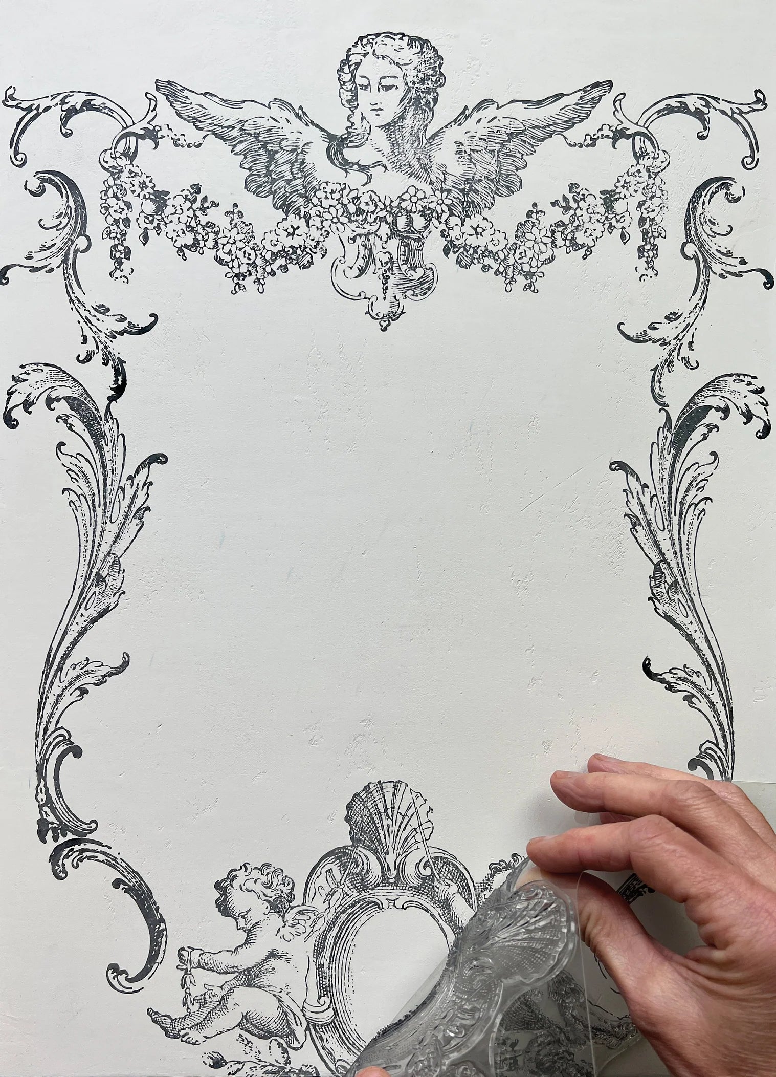 IOD Reverie Decor Stamp is a 2-sheet stamp set with many unique individual stamps including flourishes, sprigs, fronds, cherubs, and angles.