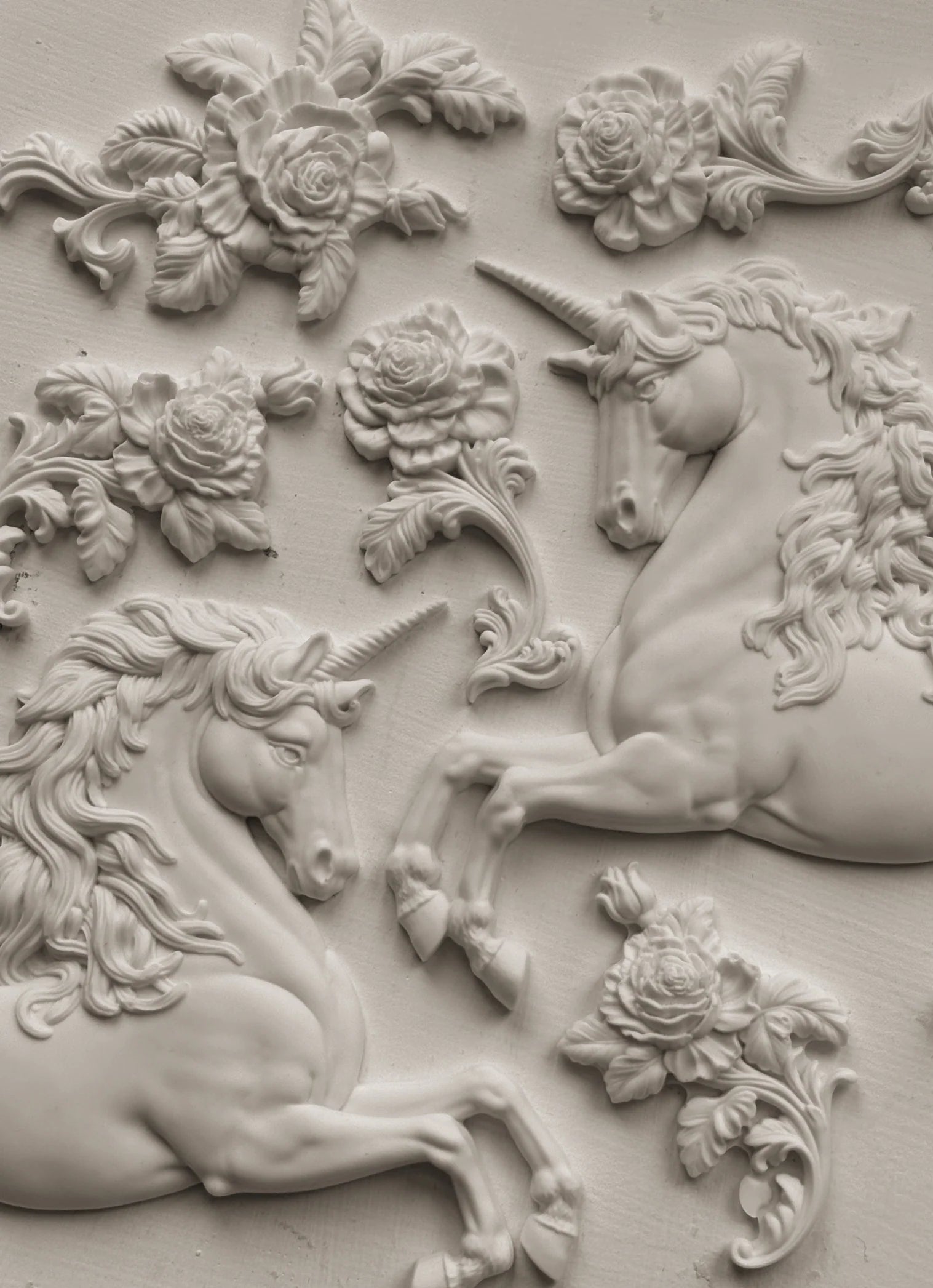 The IOD Unicorns Mould by Iron Orchid Designs is a regal nod to Renaissance Italian architecture and the lavish flourishes of baroque art. This mould emulates the mythical beauty of unicorns—long celebrated as symbols of virtue, royalty, and spirituality. Unicorns have graced art for centuries, with their symbolism woven into history. They were often depicted as representations of Christ, evoking themes of purity and divine protection.