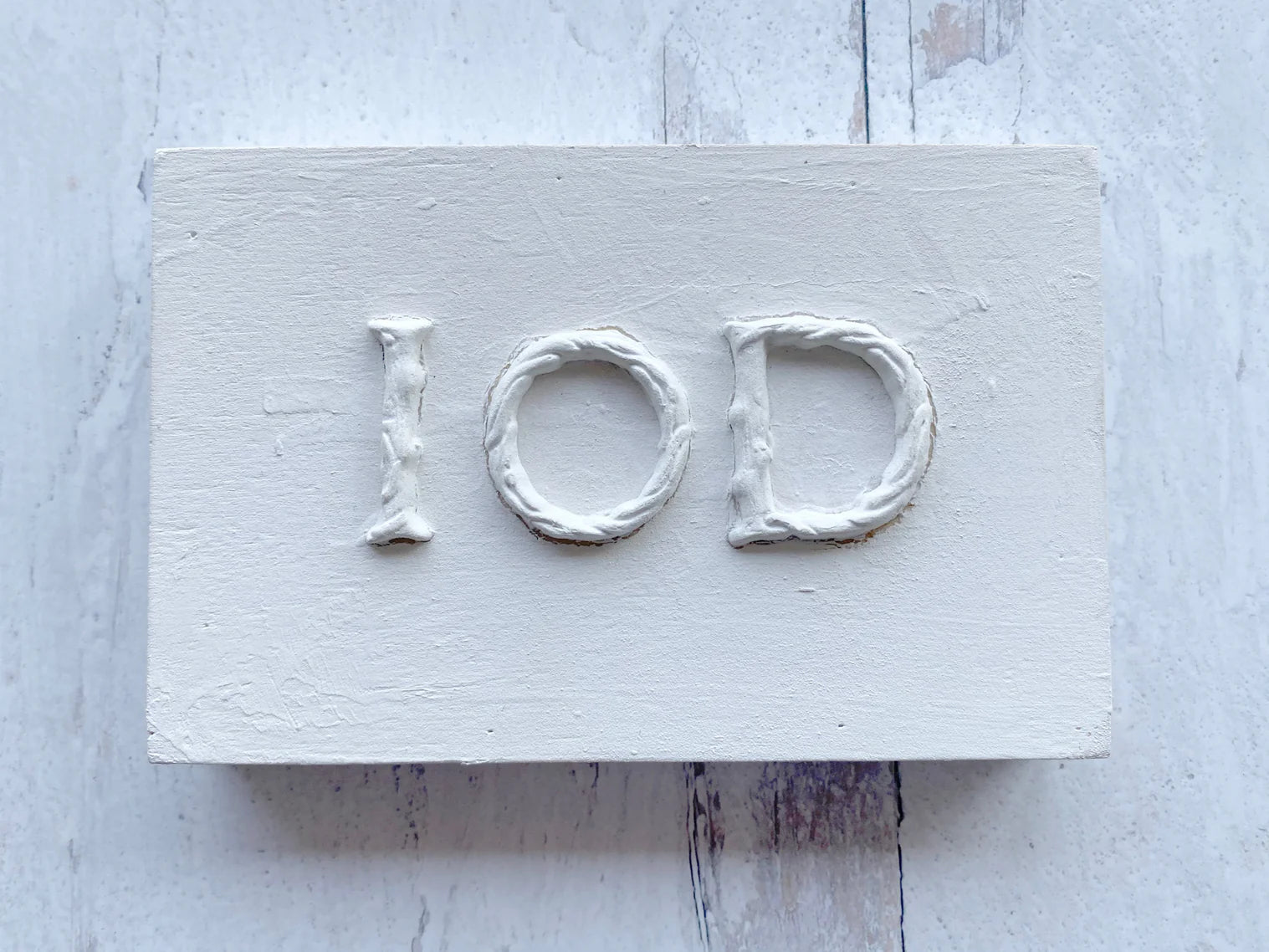 Air dry clay, or paper clay: IOD Air Dry Clay is an air dry medium, and one of our favorites. Like most paper pulp based air dry clays, some shrinking, warping, and cracking is inherent. We like these qualities for a distressed, authentically vintage look. Our favorite way to apply moulded pieces is to remove them from the mould while still moist, and adhere to the surface with the appropriate glue so it conforms well. For vertical surfaces, use a piece of low tack tape to hold it in place so it doesn’t slide.